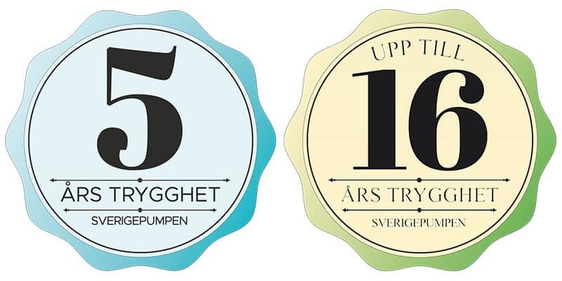 Samtliga Sverigepumpar kommer med minst 5 års trygghet – garantin täcker 3 år och en extra tilläggsförsäkring täcker resterande 2 år. När 5 år har passerat kan du årsvis själv förlänga den upp till 16 år!
